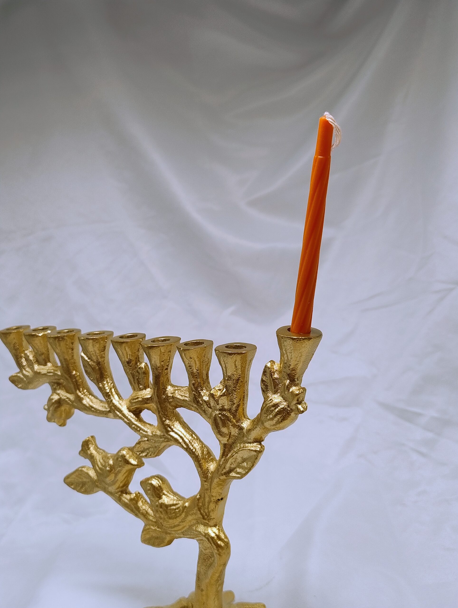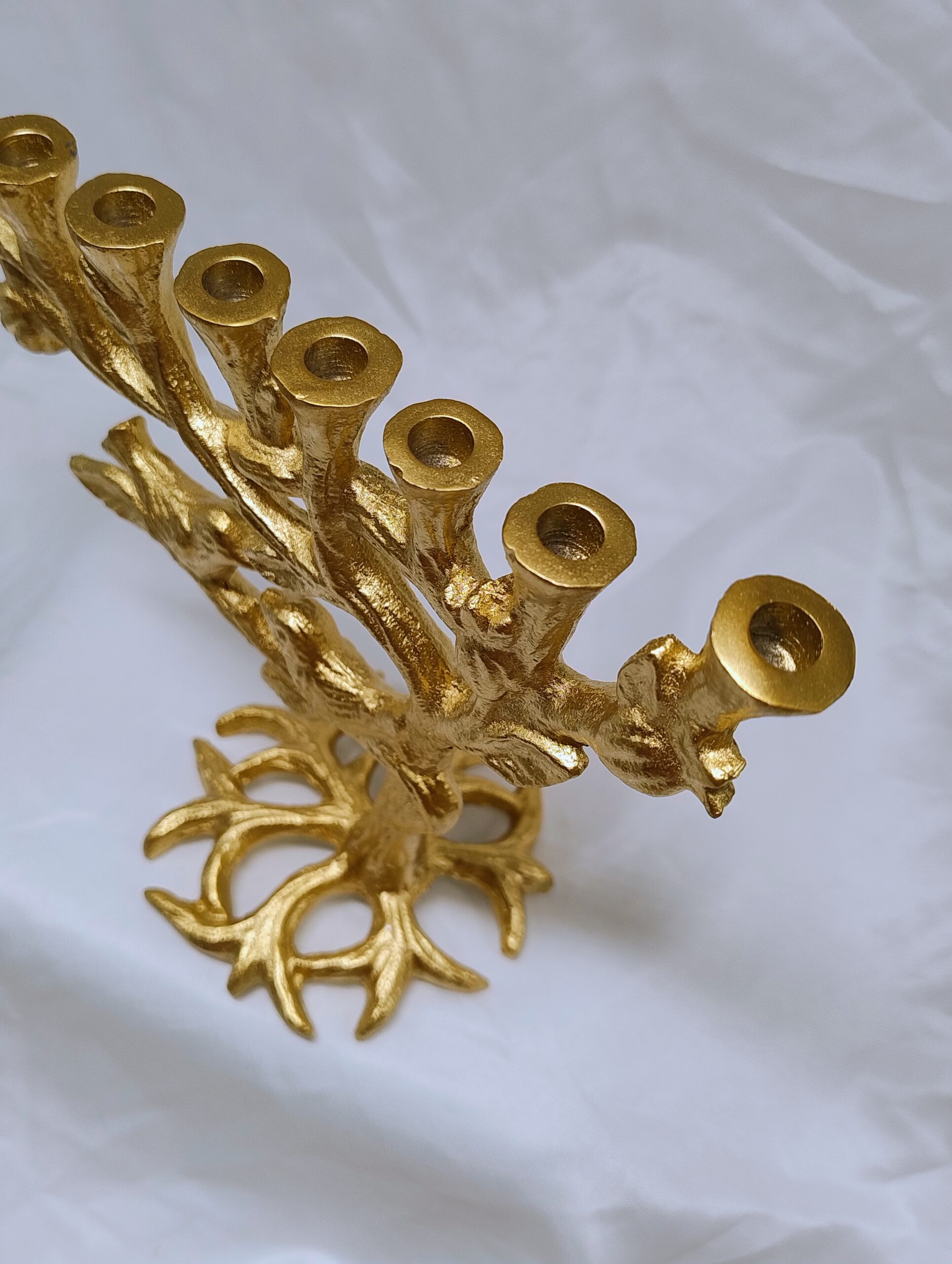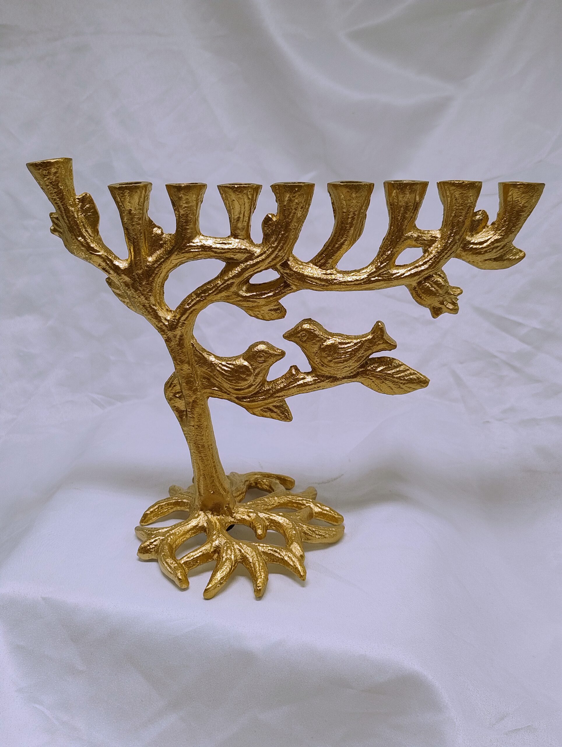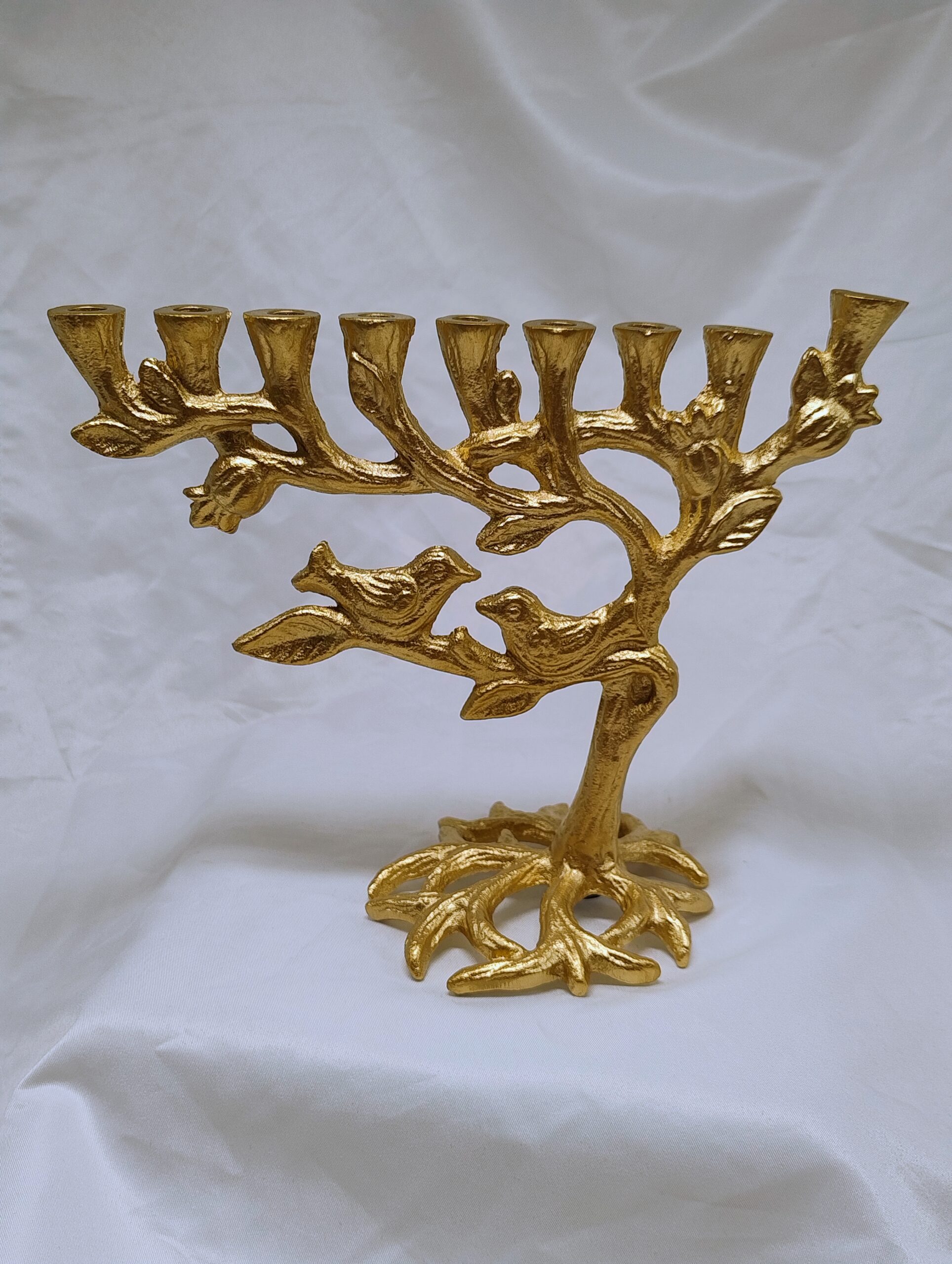 Aluminium gouden Chanoekia in de vorm van een boom met vogeltjes. Voor kaarsjes.