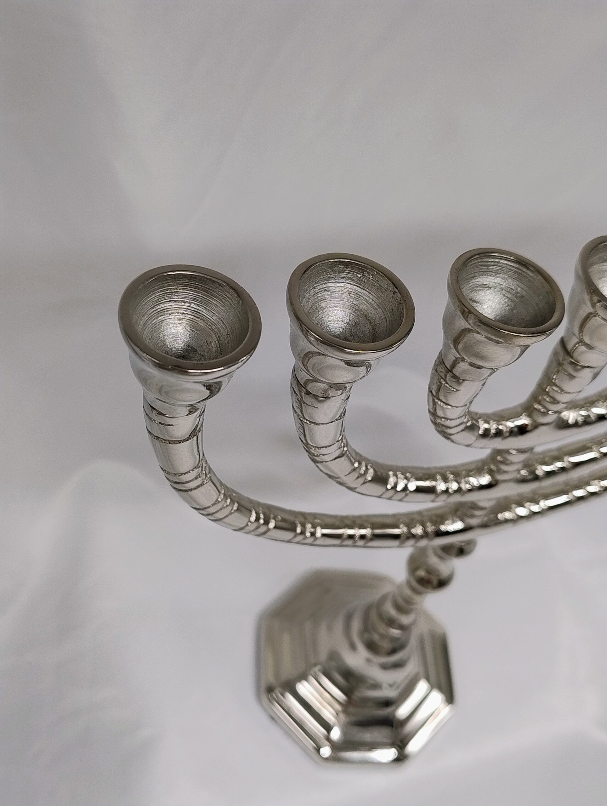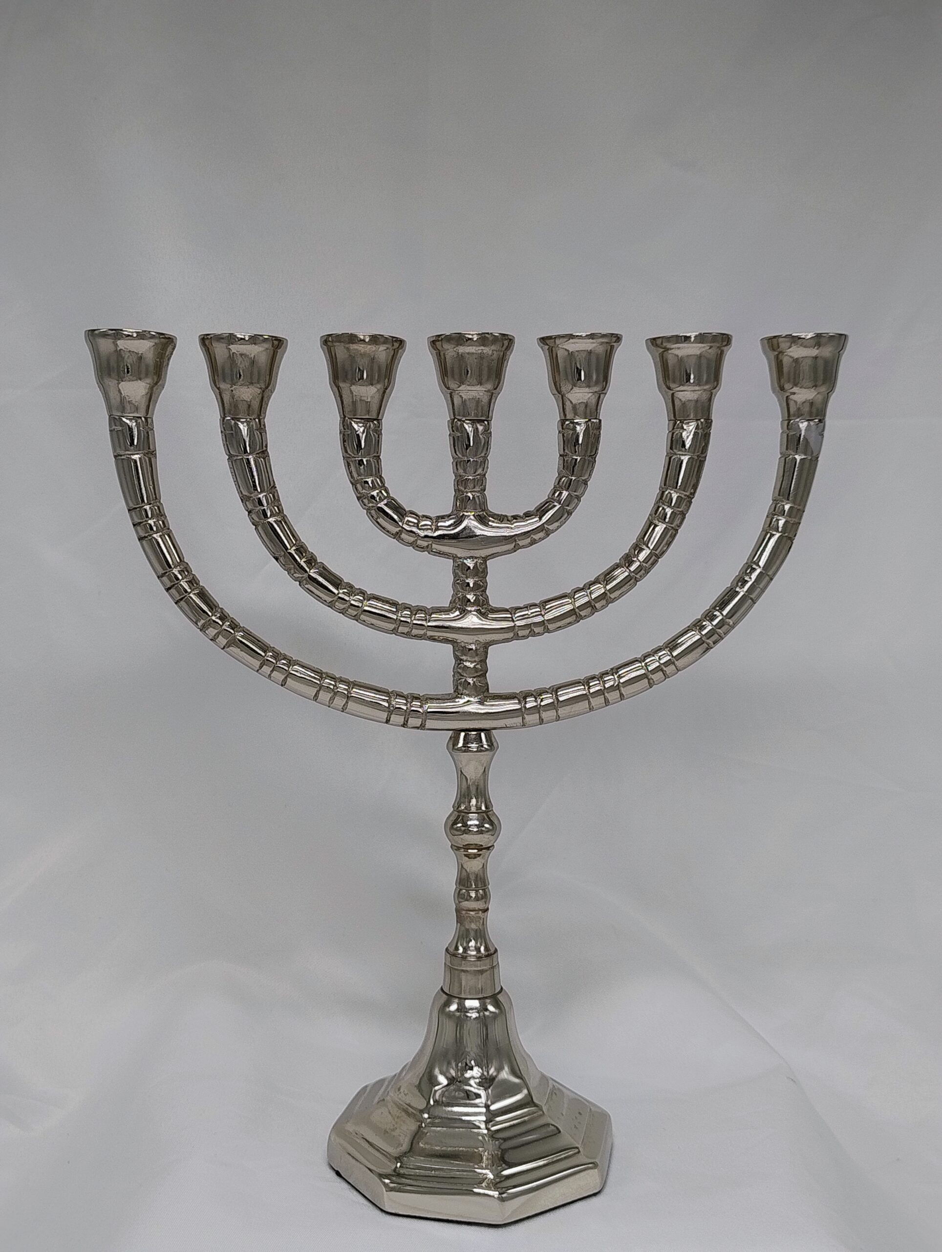 7 armige stalen Menorah met een nickel finish.